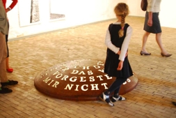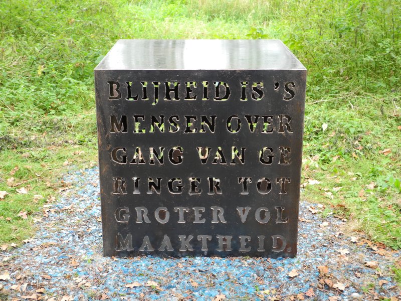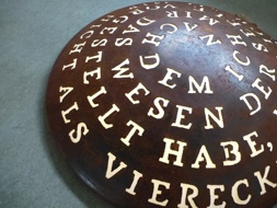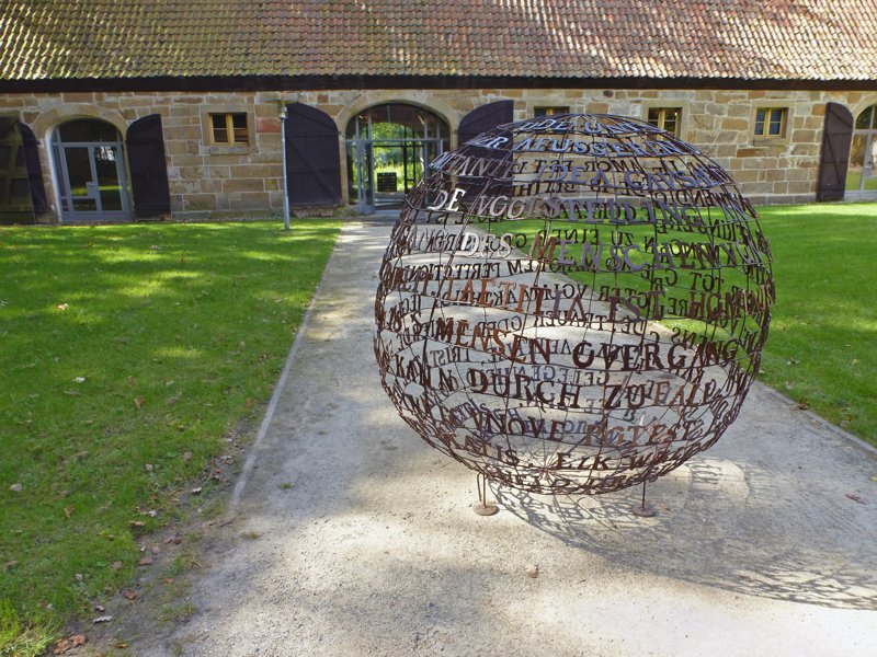 Für diese Ausstellung habe ich eine dreiteilige Arbeit mit einem "Dreieck drinnen und draußen" entwickelt, bestehend aus"Große Kugel der Freude", "Kubus der Freude" und der Kugelkalotte "Wesen der Seele" mit Texten von Spinoza aus seiner "Ethik, in geometrischer Ordnung dargestellt" und "Abhandlung zur Verbesserung des Verstandes". Durch ihre Anordnung definieren die drei Skulpturen ihren Bezug zueinander und zum Innen- und Außenraum der Ökonomie im Kloster Bentlage.