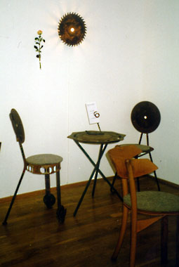 Die Umwandlung einer Hotelrezeption in ein Café durch vier Ensembles mit Stühlen, Tischen und Lampen aus Drahtbesen, Türscharnieren, Eggenzinken, Stanzresten und ähnlichem.