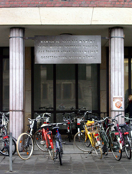Fürstenberghaus, Philosophische Fakultät der Westfälischen Wilhelms-Universität Münster. Stahltafel, 200 x 85 cm, 2003. "Handle so, dass die Maxime deines Willens jederzeit zugleich als Prinzip einer allgemeinen Gesetzgebung gelten könne." Immanuel Kant: der kategorische Imperativ, aus: Kritik der praktischen Vernunft. |