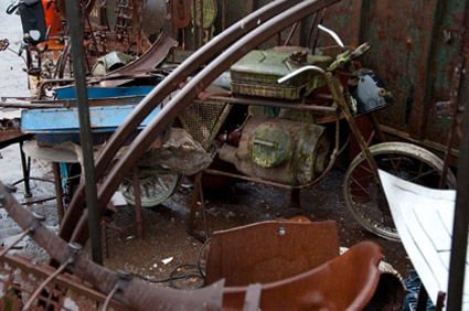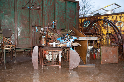 Die Nutzeisen-Möbelobjekte der verschiedenen Environments warten auf dem Schrottplatz auf ihre Umformung: Hier "Die Königliche Tafel".