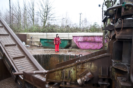 (2) Die Künstlerin übergibt ihre Objekte einer Maschine zur weiteren Verarbeitung