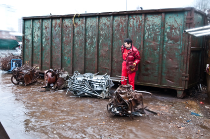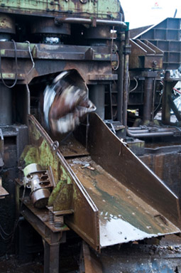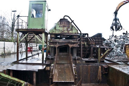 (3) Die "Königliche Tafel" vor der Presse. Objekte aus vier Environments werden nun in ihrem jeweiligen Kontext in der Schrottpresse komprimiert. Die Nutzeisen-Objekte werden in der Presse als geometrische Form begrenzt und umgeformt. Die Maschine spuckt die neuen Skulpturen aus.